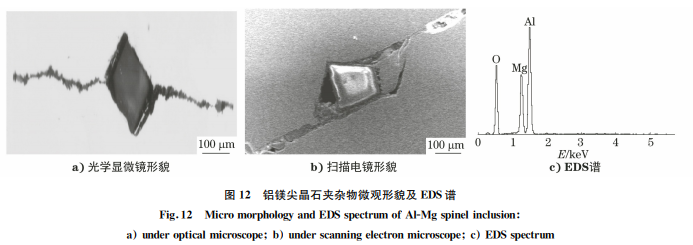 鋼中外來(lái)夾雜物主要包括來(lái)自各種耐火材料、 中包覆蓋劑、結(jié)晶器保護(hù)渣等的夾雜物。 在夾雜物分析過(guò)程中,有時(shí)會(huì)在B類夾雜物中 摻雜著較大尺寸的塊狀或顆粒物,能譜定性分析這 些塊狀或顆粒物的成分為鎂鋁尖晶石,這是混入鋼 中的耐火材料,見圖12。