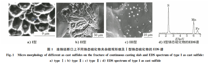 鋼中硫化物夾雜最主要的是硫化錳。硫化錳在 鋼液中不能生成,在鋼凝固時(shí)由于硫和錳的偏析,硫化物夾雜才析出于樹枝晶間。硫化物按其脫氧方法 不同,在鑄態(tài)下呈現(xiàn)3種形貌特征:Ⅰ型球狀(硅錳 脫氧、含氧高,隨機(jī)分布)、Ⅱ型枝晶狀(用鋁脫氧、含 硫高,沿晶分布)、Ⅲ型顆粒狀(過(guò)量鋁脫氧,隨機(jī)分 布)[4],冷卻速度越快,析出的硫化物顆粒越小,但數(shù) 量增多。硫化物是一種塑性?shī)A雜物,沿軋制變形方 向呈細(xì)條狀分布。