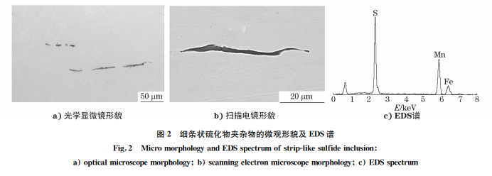 熱加工(熱軋、熱鍛)狀態(tài)下硫化物類夾雜物呈 細(xì)條狀,在顯微鏡下的光學(xué)特征是淺灰色,具有高的 延展性。能譜分析硫化物的化學(xué)組成主要是 MnS, 如果錳被一部分鐵所置換,則形成(MnFe)S,其光 學(xué)特征是深灰色,A 類硫化物形貌和成分能譜定性 分析結(jié)果見圖2。