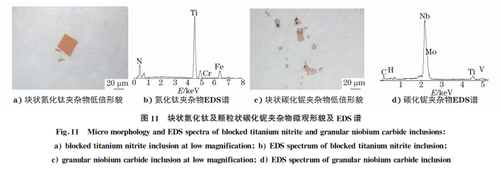 微合金化鋼中加入與氮親和力大的元素鈦、鈮、 釩、硼等元素后,當(dāng)工藝控制不當(dāng)時(shí)可生成尺寸較大 的氮化物或碳氮化物,對(duì)鋼的性能不利。鋼中常見 的氮化物為氮化鈦,其形態(tài)為方形或多邊形,呈橘紅 色,性脆,在壓力加工過(guò)程中不變形,多呈分散分布; 常見的碳化物為碳化鈮和碳化釩,多呈小塊狀或顆 粒狀,呈淺棕色,在壓力加工過(guò)程中沿縱向呈鏈狀分 布,氮化物和碳化物光學(xué)顯微鏡低倍形貌及能譜分 析成分結(jié)果見圖11。