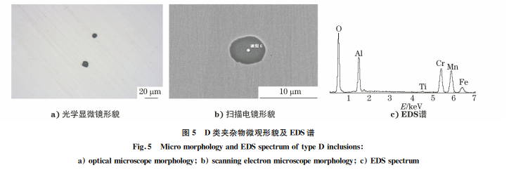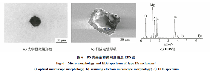 DS類夾雜物是圓形或近似圓形,直徑大于13 μm的單顆粒夾雜物。大尺寸顆粒狀?yuàn)A雜物對(duì)鋼的 使用性能影響較大,尤其是表面或皮下的大顆粒夾 雜物部位受力后易產(chǎn)生應(yīng)力集中,往往成為開裂源。 圖6是一個(gè)尺寸為45μm 的大顆粒復(fù)合夾雜物的 形貌和成分能譜定性分析結(jié)果。按標(biāo)準(zhǔn)評(píng)級(jí),該夾 雜物為DS2級(jí)。