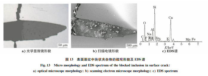 在鋼材的表面裂紋或折疊缺陷中時(shí)常發(fā)現(xiàn)外來(lái) 的不規(guī)則塊狀?yuàn)A雜物,能譜分析該類夾雜物是以氧 化硅、氧化鈣為主,并含部分氧化鈉、氧化鎂、氧化 鋁、氧化鉀、氟化鈣的復(fù)合夾雜物,由成分判斷該類 夾雜物是混入鋼中的保護(hù)渣。XRD譜中還時(shí)常出 現(xiàn)少量氧化鋯,其來(lái)源于中包水口脫落物,見圖13。