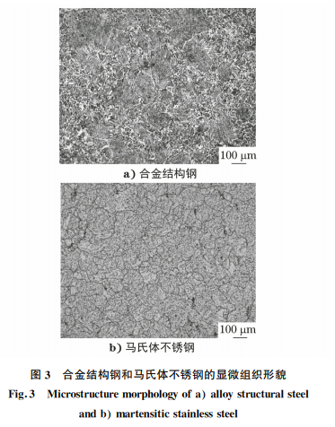 合金結(jié)構(gòu)鋼和馬氏體不銹鋼材料不同,但硬度接 近,硬度范圍在250~300HB,可使用同一個(gè)自動(dòng)制 樣程序,經(jīng)試驗(yàn)其磨拋工藝參數(shù)見表1~表2,合金結(jié) 構(gòu)鋼和馬氏體不銹鋼的顯微組織形貌如圖3所示。
