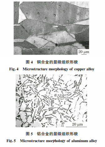 銅合金和鋁合金這兩種合金相對(duì)鐵基材料硬度 都比較軟,金相制樣都有些難度。因此磨制時(shí)盡量砂紙道數(shù)用得多些,即相鄰砂紙的號(hào)數(shù)接近;還要磨 得更細(xì)些,一般磨到1000號(hào)以上;磨頭壓力也盡量 小些,從粗到細(xì)壓力逐漸減小,每道磨削時(shí)間可以更 少。拋光盤可以選擇聚氨酯材料的,精拋時(shí)的拋光 劑最好選擇氧化物拋光液,如氧化硅或氧化鋁。采 用乙醇作為潤(rùn)滑劑,可以得到光亮的表面。銅合金 和鋁合金因化學(xué)成分不同,硬度差異也很大。鉻青 銅、鋁硅合金的金相制樣不困難,但純銅、純鋁樣品 因?yàn)樘浨乙籽趸?金相制樣相對(duì)較難。銅合金和 鋁合金的磨拋工藝參數(shù)見表3~表4,顯微組織形貌 如圖4和圖5所示。