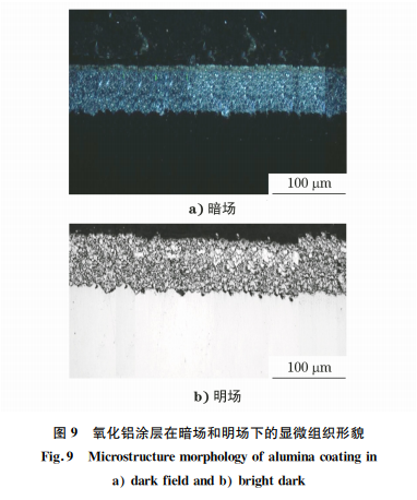 氧化鋁涂層硬度很低,容易在磨拋時(shí)倒角,影響厚 度測(cè)量。制樣要點(diǎn)也是多道次輕壓力磨。讓磨頭不轉(zhuǎn) 動(dòng),樣品的放置也與上面硬質(zhì)合金涂層和滲硼層涂層 樣品的放置一樣。拋光采用短纖維拋光織物,氧化鋁或氧化硅拋光液+乙醇作為潤(rùn)滑劑。所有涂、鍍、滲層 樣品,包括其他一些表面改性處理的樣品,如激光處 理、高頻淬火處理需要觀察表面組織的金相樣品制備, 原則上都采用這種磨樣方式。氧化鋁涂層的自動(dòng)磨拋 工藝參數(shù)見表7~表8,顯微組織形貌如圖9所示。