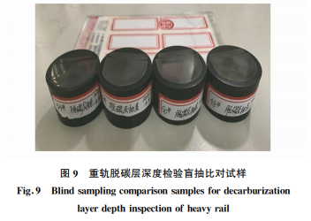 筆者單位作為負(fù)責(zé)百米高速重軌的脫碳層深度檢驗的單位,承擔(dān)著準(zhǔn)確測定百米高速重軌脫碳層 深度的職責(zé)。為持續(xù)保持在這一領(lǐng)域的檢驗?zāi)芰? 經(jīng)常參加脫碳層檢驗試驗室比對工作,脫碳層深度 檢驗結(jié)果數(shù)據(jù)比對結(jié)果滿意。比對試驗是對同一塊 百米重軌的脫碳層試樣,安排不同的職工進(jìn)行盲樣 檢測,最后對不同職工的檢驗結(jié)果進(jìn)行匯總、比較、 分析。圍繞盲樣的脫碳層深度檢驗結(jié)果的偏差進(jìn)行 再分析,盲抽比對試樣如圖9所示。