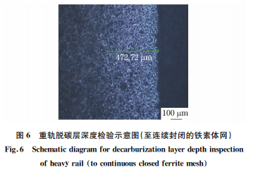 摘 要:百米高速重軌屬于高碳鋼,在加熱過程中表面極易出現(xiàn)脫碳,脫碳層深度檢驗是百米高 速重軌最重要的檢驗項目之一。TB/T2344-2012標(biāo)準(zhǔn)規(guī)定脫碳層深度不大于0.50mm,該標(biāo)準(zhǔn) 規(guī)定的脫碳層檢驗方法與GB/T224-2019標(biāo)準(zhǔn)中規(guī)定的檢驗方法不同。TB/T2344-2012標(biāo)準(zhǔn) 中脫碳層深度檢驗方法是測定試樣表面到連續(xù)封閉鐵素體網(wǎng)的深度;GB/T224-2019標(biāo)準(zhǔn)中脫 碳層深度檢驗方法則是測定試樣表面至脫碳最深處深度的平均值。