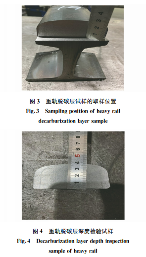 TB/T2344-2012標(biāo)準(zhǔn)中對重軌脫碳層檢驗 的取樣頻次是1000t取樣一次,而根據(jù)重軌產(chǎn)品的 特點,從安全的角度,為保證交貨質(zhì)量,企業(yè)內(nèi)部從 嚴(yán)要求,規(guī)定正常生產(chǎn)時脫碳層檢驗取樣的頻次是 500t取樣一次,比鐵道部標(biāo)準(zhǔn)規(guī)定的檢驗頻次嚴(yán)格 一倍。同時在重軌每次軋鋼初期,脫碳層取樣標(biāo)準(zhǔn) 都是要求每一批都取樣,要保證連續(xù)3批的重軌脫 碳層深度均低于0.50mm,再執(zhí)行每500t取樣一 次。如果有進(jìn)行工藝調(diào)試、加熱爐出現(xiàn)故障或軋線出現(xiàn)故障的情況出現(xiàn),重軌脫碳層深度檢驗執(zhí)行批 批取樣的制度。在百米高速重軌脫碳層取樣及檢驗 崗位規(guī)程的編制上,將TB/T2344-2012標(biāo)準(zhǔn)中的 脫碳層取樣和檢驗的規(guī)定全部采納,同時把企業(yè)內(nèi) 部對重軌脫碳層的取樣頻次和檢驗要求納入崗位規(guī) 程,以保證重軌脫碳層深度檢驗結(jié)果的可信度。