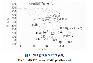 隨著管線鋼鋼材強度的提高,高鋼級管線鋼 焊接接頭產(chǎn)生焊接冷裂紋的傾向也增大。因此制 定合理的焊接工藝,避免焊接冷裂紋的產(chǎn)生是焊 接生產(chǎn)的關(guān)鍵。以往焊接工藝參數(shù)的確定是以焊 接工藝評定試驗來確定。在實際的工作中主要根 據(jù)掌握的材料焊接性能再結(jié)合工程特點與設(shè)計、 工藝要求及合格的焊接工藝制定出適合具體施工 要求的焊接工藝參數(shù)[1]。而模擬焊接試驗則可以 節(jié)約大量的人力和物力,因此現(xiàn)在常采用模擬焊 接試驗來研究材料的焊接性能,從而確定焊接工 藝參數(shù)。筆者采用 Gleeble3500型熱模擬試驗機 對 X80管線鋼進(jìn)行模擬,繪制出了 X80鋼的模擬 焊接熱影響區(qū)連續(xù)冷卻轉(zhuǎn)變(SHCCT)曲線,分析 了顯微組織和硬度隨冷卻速率的變化情況。通過 分析典型熱輸入對 X80鋼熱影響區(qū)沖擊韌性的影 響,結(jié)合組織和硬度隨冷卻速率的變化情況,以及 冷裂紋敏感性指數(shù)的計算,提出了 X80鋼焊接時 較合理的熱輸入范圍。