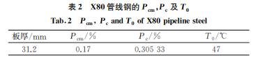 首先計算 X80 鋼的焊接冷裂紋敏感性指數(shù) Pcm,在Pcm 指數(shù)的基礎(chǔ)上計算出焊接冷裂紋敏感 性Pc,同時計算出不產(chǎn)生冷裂紋的預(yù)熱溫度T0,結(jié) 果如表2所示。