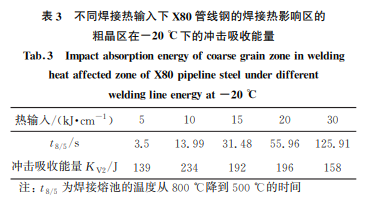 在熱模擬試驗機上采用 Rykalin2D模型分別 進(jìn)行了熱輸入為5,10,20,30kJ·cm-1的焊接熱循 環(huán)試驗,模擬X80鋼在不同焊接熱輸入下焊接熱影 響區(qū)粗晶區(qū)的沖擊性能,如表3所示。