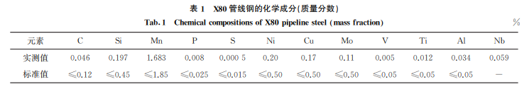 試驗材料選自某廠生產(chǎn)的 X80管線鋼直縫埋弧焊管,生產(chǎn)工藝為熱機械控制工藝(TMCP),其化 學(xué)成分見表1。鋼管的力學(xué)性能優(yōu)良,屈服強度為 601 MPa,抗拉強度為 677 MPa,斷后 伸 長 率 為 25.5%,沖擊吸收能量為329J。