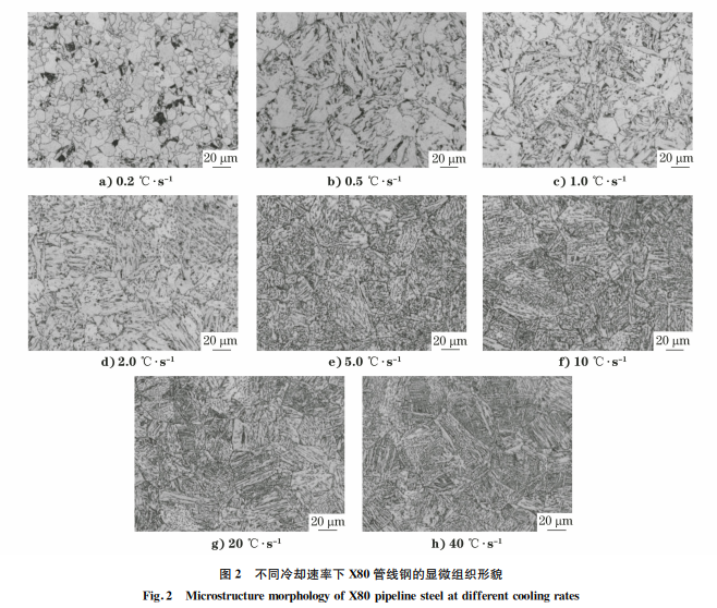 X80鋼試樣在不同冷卻速率下的顯微組織形貌 如圖2所示。當(dāng)冷卻速率為0.2℃·s-1時,試樣的 顯微組織為鐵素鐵+珠光體,當(dāng)冷卻速率增加到 0.5℃·s-1時,貝氏體開始析出,隨著冷卻速率的增 加,鐵素體和珠光體的含量逐漸減少,貝氏體的含量 逐漸增加,當(dāng)冷卻速率達(dá)到5℃·s-1時,完全轉(zhuǎn)變?yōu)?貝氏體組織。貝氏體主要以板條貝氏體為主,隨著 冷卻速率的增加晶界內(nèi)的鐵素體基體板條變細(xì),馬/ 奧島(M/A)組織呈連續(xù)或半連續(xù)的形態(tài)分布在基 體上,數(shù)量逐漸增多,同時組織取向也變得越加明 顯。當(dāng)冷卻速率達(dá)到20℃·s-1時,馬氏體組織開始 析出,顯微組織為粒狀貝氏體+板條馬氏體,隨著溫 度的降低,貝氏體的含量逐漸減少,馬氏體的含量逐 漸增加。馬氏體的組織硬而脆,因此,應(yīng)避免在較快 的冷卻速率下進(jìn)行焊接[4]。
