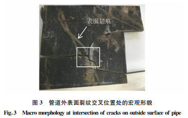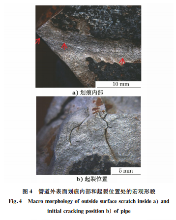 在體視顯微鏡下觀察管道外表面裂紋交叉位置 處的宏觀形貌。由圖3可見,管道外表面有兩道較 為明顯的劃痕一直延伸到裂紋交叉位置,劃痕深度 超過0.3mm,最深達0.75mm。由圖4可見:劃痕 內(nèi)部存在大量肉眼可見的垂直于劃痕的裂紋,開裂 面上有明顯的起裂痕跡,裂紋表面可見明顯的起源 區(qū)、霧化區(qū)和擴展區(qū),可以確定該處為裂紋起裂位 置,表明管道開裂與貫穿該處的劃痕有關(guān);另外,裂 紋表面可見與裂紋擴展方向平行的臺階狀和山脊狀 凸起,并呈放射狀分布。