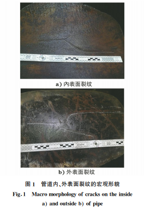 管道內(nèi)、外表面裂紋的宏觀形貌如圖1所示。由 圖1可見:管道內(nèi)表面裂紋長度約為280mm,兩條主 裂紋尚未完全斷開;管道外表面的裂紋整體上呈叉子狀,長度約為360mm。從內(nèi)外裂紋長度可以判斷管 道是從外表面起裂,并逐漸向內(nèi)表面擴展的。