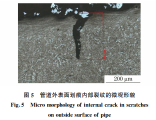 從圖3所示劃痕位置取樣,觀察劃痕內(nèi)部裂紋 的微觀形貌。由圖5可見,劃痕內(nèi)部微裂紋深度約 為270μm,劃痕表層存在明顯的形變特征,表明在 外力作用下劃痕處發(fā)生了劇烈的變形。在叉車起運 過程中管道容易受到叉車臂的碰撞、摩擦,在組裝、 吊運過程中管道也容易發(fā)生撞擊。當外力強度超過 了材料的屈服極限時,管道表面會形成較深的劃痕 并產(chǎn)生局部應(yīng)力集中,進而形成許多微裂紋。