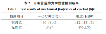 按照GB/T231.1-2009《金屬材料 布氏硬度試 驗 第1部分:試驗方法》和GB/T229-2007《金屬材 料夏比擺錘沖擊試驗方法》,從管道裂紋附近區(qū)域取 樣,進行布氏硬度試驗和沖擊試驗。由表2可知,開 裂管道的沖擊韌性和硬度均滿足標準的技術(shù)要求。