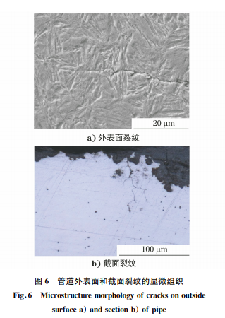 從圖1所示裂紋的末端取樣,分別對外表面和 截面裂紋進行觀察。由圖6可見:外表面裂紋沿著 晶粒邊界擴展,具有應(yīng)力腐蝕和氫致開裂特征[5],裂 紋附近未見夾渣、夾雜物等缺陷,表明開裂與管道材 質(zhì)無關(guān);截面裂紋可見大量細小的二次裂紋,具有分 叉結(jié)構(gòu),尾部較為尖銳,呈明顯的應(yīng)力腐蝕特征[6-7]。 管道表面劃傷后存在應(yīng)力集中,在海水環(huán)境中容易 發(fā)生腐蝕,導(dǎo)致管道產(chǎn)生裂紋。