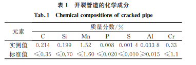 根據(jù)ASTME1019-11《不同燃燒和熔融技術(shù)測 定鋼、鐵、鎳、鈷合金中碳、硫、氮、氧合量的標準試驗 方法》和JISG1253-2002《鋼鐵火花放電原子發(fā)射 光譜分析法》,對開裂管道進行化學(xué)成分分析,在國 家認可的鋼鐵材料測試中心進行檢測。由表1可 知,開裂管道的化學(xué)成分滿足標準的技術(shù)要求。