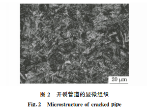 從管道裂紋附近處取樣,經(jīng)鑲嵌、研磨后,用 4%(質(zhì)量分數(shù))硝酸酒精浸蝕,采用光學(xué)顯微鏡進行 觀察。由圖2可見,管道基體組織為正常的低溫回 火馬氏體組織。