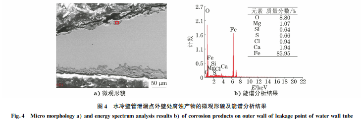在水冷壁管泄漏點處截取試樣,經(jīng)鑲嵌、磨拋 后在顯微鏡下觀察,泄 漏 點 處 的 微 觀 形 貌 見 圖 3a),從形貌可判斷其穿孔是從管道外壁向內(nèi)壁擴 展。進(jìn)一步放大外壁處,可見其表面存在腐蝕產(chǎn) 物,見圖3b)。對腐蝕產(chǎn)物進(jìn)行能譜分析,結(jié)果見 圖4,檢測到有較高含量的硫和氯等腐蝕性元素, 以及鈉、鎂、鉀和鈣等元素。判定是由硫和氯元素 引發(fā)電化學(xué)反應(yīng)從而使材料發(fā)生腐蝕,從而穿孔 的[3]。