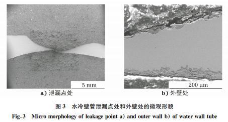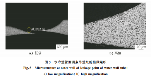 在水冷壁管泄漏點外壁處截取試樣,經(jīng)鑲嵌、磨 拋及浸蝕后進(jìn)行顯微組織觀察。由圖5可見,管外 壁可見明顯的減薄區(qū)域,放大觀察泄漏點處,顯微組 織為鐵素體+珠光體,組織未見變形[4],見圖5b), 說明管壁沒有發(fā)生塑性變形。