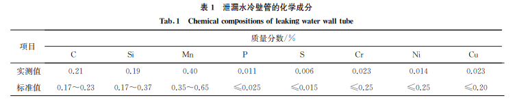 從泄漏水冷壁管上截取試樣進(jìn)行化學(xué)成分分析, 結(jié)果見表1。由表1可見,水冷壁管的化學(xué)成分符合 GB/T5310-2017《高壓鍋爐用無縫鋼管》的技術(shù)要求。