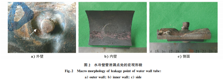 水冷壁管泄漏點處的宏觀形貌見圖2a),可見泄 漏點位于銷釘附近的管壁凹陷處,該區(qū)域附近呈深灰 色。通過機械加工方法截取泄漏點處試樣,其內(nèi)壁的 宏觀形貌見圖2b)。對試樣側(cè)面進(jìn)行觀察,外壁可見 凹陷,內(nèi)壁未見異常,管壁整體發(fā)生減薄,見圖2c)。