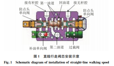 直線行走閥在挖掘機行走過程中通過閥芯的運 動對液壓油實施再分配,從而完成動臂升降、斗桿收 放、鏟斗轉動、轉臺回轉4組動作中的一個或其中任 意兩個動作,圖1所示為直線行走閥芯的安裝示意 圖。正常情況下,閥芯作為重要組件做軸向往復運 動,承受循環(huán)載荷,其失效形式多表現(xiàn)為疲勞斷裂。 由于挖掘機工作環(huán)境較為惡劣,在分析閥芯疲勞斷 裂的原因時,應考慮機械振動引入的橫向載荷作用。 相關文獻[1-2]介紹了振動疲勞在疲勞分析中的應用, 近年來,國內學者們也從不同角度開展了大量與疲勞相關的研究[3-6],并取得了豐碩的成果。
