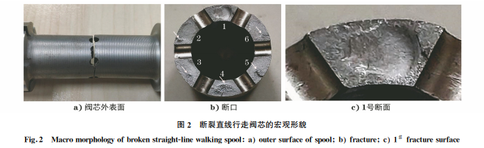 圖2a)為直線行走閥芯的外表面,外表面未見 明顯塑性變形和磕碰、擦傷等情況,表現(xiàn)為脆性斷裂 特征;斷裂面穿過油孔中心且與軸向垂直。圖2b) 為直線行走閥芯斷口表面的宏觀形貌,斷裂處由六 個獨立的斷面組成,各斷面較平整、潔凈,呈暗灰色, 均呈疲勞斷裂特征。將六個斷面進行編號,分別記 為1~6號,如圖2b)所示。根據(jù)瞬斷區(qū)(圖2b)中的 箭頭處)的大小可判斷1號位置處首先發(fā)生斷裂,2 號和6號、3號和5號、4號位置依次萌生疲勞裂紋, 裂紋擴展到一定程度后整體發(fā)生瞬斷。由圖2c)可 見,1號斷面優(yōu)先從左上角棱角起裂,整個斷面疲勞 擴展充分,幾乎無瞬斷區(qū),表明斷裂處名義應力 很小。