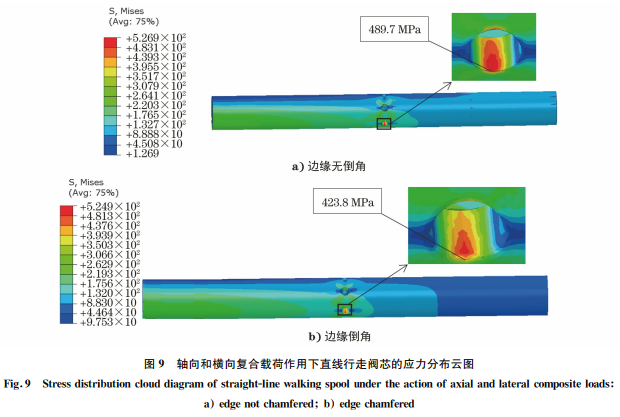 該直線行走閥芯正常工作時的最大軸向拉伸載荷約為18kN,閥芯6個油孔處應力狀態(tài)完全相 同,最大應力(約為293 MPa)位于油孔軸向中部 位置,油孔邊緣應力約為229 MPa,如圖7所示。 考慮到挖掘機工作環(huán)境惡劣,假設服役過程中存 在震動引入的橫向載荷。在最大軸向拉伸載荷基 礎上,在閥芯1/4處施加橫向載荷(1kN),邊緣無 倒角有限元模型如圖8所示。由圖9a)可見,6個 油孔處應力狀態(tài)各不相同,橫向載荷側的拉伸應 力顯 著 增 大 至 527 MPa,同 側 邊 緣 應 力 約 為 490MPa,表明在復合載荷作用下,應力峰值位置 明顯向受拉側的油孔外圓面邊緣處移動。進一步 對邊緣進行倒角(R 為0.5mm)處理后,結果如圖 9b)所示,應力分布云圖與邊緣無倒角時的并無明 顯差異,邊緣處應力略有下降。