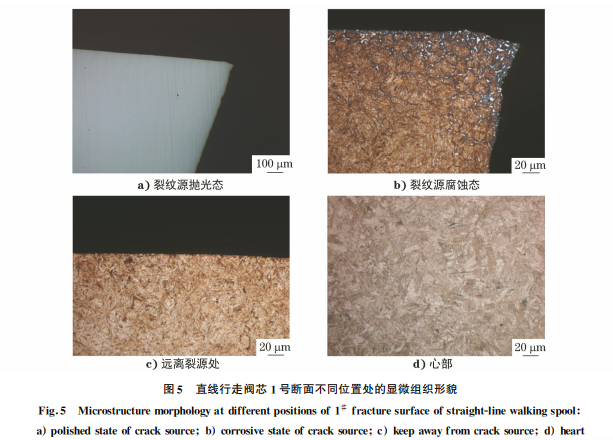 由圖5可見:裂紋源處為尖角結構,應力集中現(xiàn) 象明顯;裂紋源處組織為針狀回火馬氏體+體積分 數(shù)約10%的殘余奧氏體+斷續(xù)網狀分布的碳化物, 碳化物投影長度為10~20μm,這與掃描電鏡分析 結果相吻合;遠離裂源處的表面組織為針狀回火 馬氏體+體積分數(shù)約5%的殘余奧氏體,未見粗顆粒碳化物;心部組織為板條狀回火馬氏體+少量貝 氏體,奧氏體晶粒度評定級別為8級。
