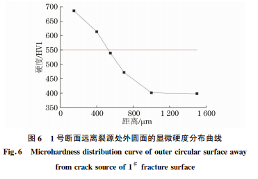 對1號斷面裂紋源處進行顯微硬度試驗,對遠 離裂紋源的外圓面進行顯微硬度和顯微硬度梯度試 驗。結果表明:裂紋源處顯微硬度約810HV1,明 顯高于 遠 離 裂 紋 源 處 的 外 圓 面 的 硬 度 (約 為 700HV1)。圖 6 顯 示 有 效 硬 化 層 深 度 約 為 0.5mm,滿足技術要求(0.3~0.6mm)。