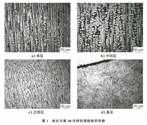 在組合方案3B 試樣垂直焊道的截面處取樣, 并對其進行金相檢驗,結(jié)果如圖1所示。由圖1可 知 :試樣表層和中間層的組織均為γ固溶體+析出物,呈枝晶特征,晶內(nèi)和晶界處均可見析出物,中間 層的析出物比表層多,這可能與過渡層和基層元素 的遷移有關(guān);過渡層為γ奧氏體+δ鐵素體組織,呈 典型的樹枝晶特征;基層為貝氏體組織,熔合線附近 存在不連 續(xù) 的 黑 色 馬 氏 體 帶,符 合 堆 焊 熔 合 區(qū) 特 性[8]。表明試樣的顯微組織正常,未見微觀裂紋和 其他微觀缺陷。