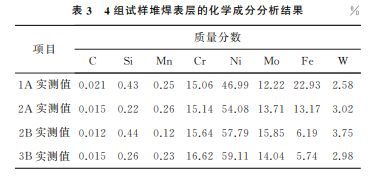 在4組試樣距堆焊層表面約3mm 處分別取樣, 進行堆焊表層的化學(xué)成分分析,結(jié)果如表3所示。