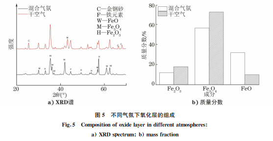 分別在干空氣和含有12.17g·m-3H2O(g)的 混合氣氛下,將55SiCr彈簧鋼試樣于700℃時(shí)保溫90min。干空氣時(shí)試樣的質(zhì)量增加明顯大于混合 氣氛時(shí)的,如圖4所示,質(zhì)量增加率約36%。以單 位面積的質(zhì)量增加表征氧化層厚度,則結(jié)果表明 干空氣下氧化層厚度更大。取試樣表面氧化產(chǎn)物 粉末進(jìn)行 X射線衍射(XRD)分析,結(jié)果如圖5所 示,其中金剛砂為砂紙顆粒成分,純鐵為打磨氧化 物時(shí)摻雜的基體物質(zhì),再采用 K值法得到各氧化 產(chǎn)物質(zhì)量分?jǐn)?shù),在不同氣氛下氧化產(chǎn)物均以Fe3O4 為主,但與干空氣相比,混合氣氛條件下氧化產(chǎn)物 比重向 FeO 傾斜,即 Fe2O3 和 Fe3O4 比重降低, FeO比重增大。