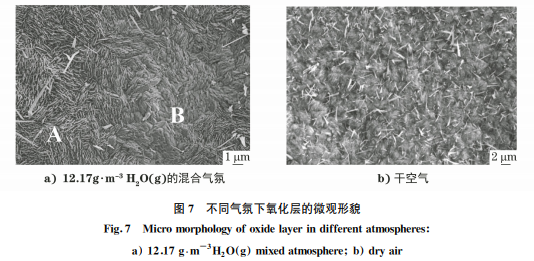 周旬等[27]提出的鐵氧化物是非整比化合物,離 子晶體中存在著陽離子空位??瘴粷舛鹊淖兓瘺Q定 了陽離子擴(kuò)散速率的變化,空位濃度越高,陽離子擴(kuò) 散速率越大。相比干氧條件,飽和水汽條件下FeO 層的厚度占比較大。其中,FeO 為典型的非整比化 合物,FeO 中存在大量陽離子空位,這些陽離子空 位形成了離子傳輸?shù)目焖贁U(kuò)散通道,減少了氧化與 脫碳介質(zhì)入侵基體的阻力,加劇了材料的脫碳程度。 另外,在水汽混合氣氛下,試樣表面氧化層呈現(xiàn)為 “在灰色疏松基體上散落分布白色片條狀氧化物”的 狀態(tài),如圖7a)所示,可見疏松基體物相為氧化層最 外部的Fe2O3,呈現(xiàn)為任意堆積的纖細(xì)條棒狀。剝 去表面疏松的Fe2O3 組織,所露出的氧化產(chǎn)物呈現(xiàn) 出了兩種特征結(jié)構(gòu),A為不規(guī)則塊狀結(jié)構(gòu)堆砌而成, B為較粗的不規(guī)則條狀結(jié)構(gòu)堆砌而成。無論是表層 還是下層氧化物,其形貌結(jié)構(gòu)均較為疏松,并含有較 多的孔洞。圖7b)為干空氣條件下的氧化層形貌, 與水汽條件下的氧化層形貌相比,干空氣條件下試 樣表面氧化鐵皮的致密度較大,阻擋氧化性氣體進(jìn) 入基體的作用更強(qiáng)。