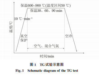 試驗(yàn)材料取自55SiCr彈簧鋼(中碳彈簧鋼)的 連鑄坯,鑄坯尺寸為120mm×120mm,主要化學(xué) 成分(質(zhì)量分?jǐn)?shù),%)為:wC0.51~0.59,wSi1.30~ 1.60,wMn0.60~0.80,wCr0.60~0.80,wAl0.03,wTi 0.005,余量wFe。試驗(yàn)前先將彈簧鋼表面的氧化脫 碳層削去,以保證鋼坯的化學(xué)成分從表層至中心均 勻一致,然后將鋼坯在試樣切割機(jī)上切成大小為 ?5mm×0.3mm的試樣,在砂紙上打磨至1000 目并用超聲波清洗后置于熱重微量天平內(nèi)進(jìn)行熱重 (TG)試驗(yàn)。原始試樣的顯微組織主要為珠光體,根 據(jù)GB/T6394-2017《金屬平均晶粒度測(cè)定方法》 測(cè)定得到珠光體團(tuán)的平均晶粒半徑為23.55μm。 借助差熱熱重分析儀(TG/DSC),將試樣于空氣和 混合氣氛條件下加熱至試驗(yàn)溫度并保溫一定時(shí)間, 保溫結(jié)束后空冷至室溫,試驗(yàn)示意圖如圖1所示。 其中,混合氣氛根據(jù)實(shí)際生產(chǎn)中加熱爐內(nèi)氣氛所設(shè) 定,將 N2、CO2、O2 及 H2O(g)按一定比例(體積分 數(shù))混合得到:(15%~20%)CO2+(2%~4%)O2 +H2O+N2(余量)。該脫碳試驗(yàn)設(shè)計(jì)的水汽含量 為5.77g·m-3和12.09g·m-3,對(duì)比試驗(yàn)為空氣條件下 保 溫,共 兩 組 保 溫 時(shí) 間,分 別 為 30 min 和 60min。氧化試驗(yàn)水汽含量為12.17g·m-3,對(duì)比 試驗(yàn)為干空氣條件下保溫,保溫時(shí)間90min。