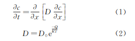 式中:x 為位置坐標(biāo);c 為碳濃度;D 為擴(kuò)散系數(shù); D0 為指前因子;R 為氣體常數(shù);Q 為碳原子擴(kuò)散激 活能;T 為溫度。