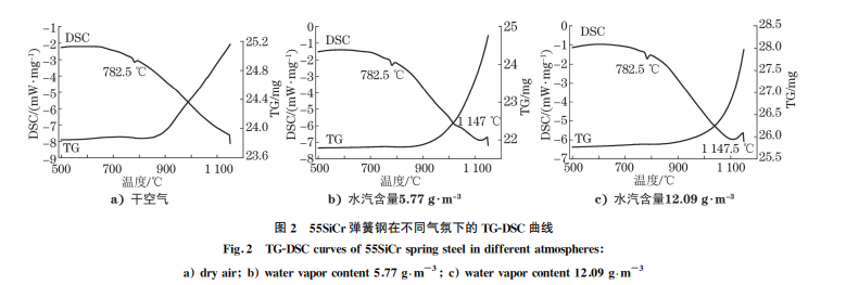 圖2為55SiCr彈簧鋼在3種氣氛條件下的TGDSC曲線。從 DSC曲線可以看出,3種氣氛條件在 500~1150℃內(nèi)各有不同的主峰。3條DSC曲線在 782.5℃均有一個(gè)吸熱峰,結(jié)合TG曲線進(jìn)行分析,在 500~875℃質(zhì)量變化較小,且吸熱峰對(duì)應(yīng)溫度相同, 吸熱峰主要由相變所致。由 DSC曲線還可以看出, 水汽條件下存在放熱峰,而干空氣條件下無明顯放熱 峰。結(jié)合TG曲線和DSC曲線進(jìn)行分析可知,盡管氣 氛條件不同,但在500~800℃時(shí),55SiCr彈簧鋼的質(zhì) 量變化較小,吸熱峰由鐵素體相變?yōu)閵W氏體所致;當(dāng) 溫度超過900℃后,水汽氣氛條件下55SiCr彈簧鋼 的質(zhì)量明顯增加,放熱峰主要由氧化所致。由圖2中 TG曲線還可以看出,升溫過程可以分為兩個(gè)部分,在 875℃之前,氧化引起的質(zhì)量變化增加較小;當(dāng)溫度 超過875℃,氧化引起的質(zhì)量變化快速增加,且水汽含量越多,氧化引起的質(zhì)量變化增加越明顯。