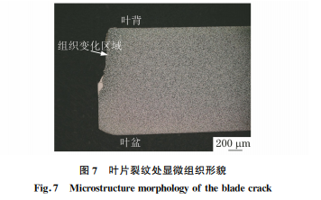 葉片上的裂紋為試車過程中產(chǎn)生的疲勞裂紋。 發(fā)動機(jī)試車拆解復(fù)裝后的葉尖徑向間隙不滿足設(shè)計 要求而發(fā)生刮擦是產(chǎn)生疲勞裂紋的主要原因。