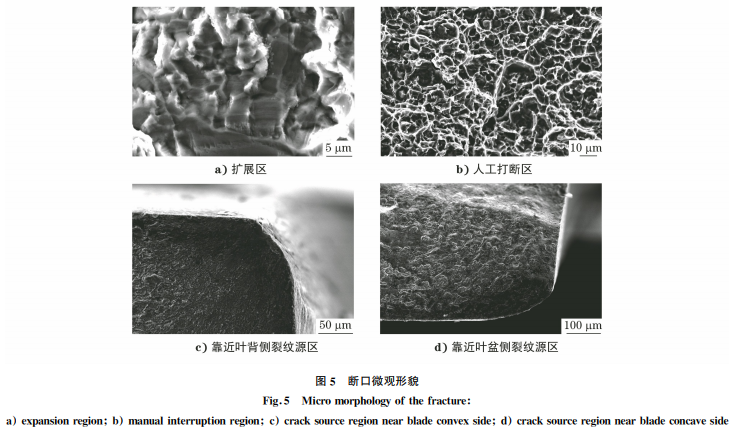葉尖端面有明顯的摩擦痕跡,裂紋基本與摩擦 痕跡垂直,且葉盆位置裂紋開口最大,表明裂紋是由 摩擦引起的且在葉盆位置起源。在靠近葉背部分, 出現(xiàn)掉塊,形成新的裂紋源并繼續(xù)擴(kuò)展,導(dǎo)致裂紋擴(kuò) 展方向改變,在斷口上顯示出兩個裂紋源區(qū)。斷口 大面積為擴(kuò)展區(qū),擴(kuò)展區(qū)可見疲勞弧線,葉尖端面附 近為灰黑色,向內(nèi)逐步變?yōu)榻瘘S色,在葉尖位置摩擦 形成過燒和局部掉塊,使葉片的疲勞性能大幅降低, 形成疲勞裂紋[10]。