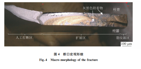 將1號裂紋人工打開后在體視顯微鏡下觀察, 如圖4所示。可見斷面較為平坦,放射棱線明顯,根 據(jù)棱線收斂方向可知有兩處裂紋源區(qū),均位于葉尖 端面與葉身轉(zhuǎn)角位置,一處靠近葉背側(cè),其擴(kuò)展區(qū)域 面積約占斷面面積的30%;另一處起源靠近葉盆 側(cè),其擴(kuò)展區(qū)域約占斷面面積的70%,兩處裂紋源 區(qū)擴(kuò)展合并后主要以靠近葉盆的裂紋源區(qū)擴(kuò)展方向 繼續(xù)擴(kuò)展。裂紋源區(qū)部分呈灰黑色,擴(kuò)展區(qū)顏色沿 葉身向內(nèi)逐漸變?yōu)榻瘘S色,局部有大量灰黑色附著 物,說明葉尖端面存在超溫現(xiàn)象,沿葉身向內(nèi)溫度逐 漸降低,導(dǎo)致出現(xiàn)色帶。