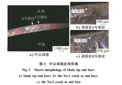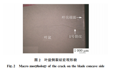 在體視顯微鏡下觀察葉片裂紋形貌,兩條裂紋 均呈直線狀,一條為貫穿葉尖端面厚度(1.54mm) 的裂紋,長度約8mm(以下稱為1號裂紋),另一條 裂紋在葉背處(以下稱為2號裂紋),距離1號裂紋 1.5mm,長度約1mm。在葉背裂紋附近發(fā)現(xiàn)有明 顯的氧化色,端面呈灰黑色,向內(nèi)逐漸變?yōu)樗{(lán)色,最 大深度在0.7mm 左右,如圖1所示。在葉盆側(cè)葉 尖端面與葉身轉(zhuǎn)角位置有輕微的磨損痕跡,呈金屬 亮色,未見明顯的氧化特征,如圖2所示。