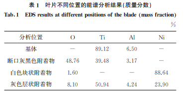 與葉片配合的機(jī)匣基體材料為 TC2鈦合金,表 面為鎳石墨封嚴(yán)涂層,以提高發(fā)動機(jī)的氣路封嚴(yán)效 率,屬于低溫可磨耗涂層,工作溫度在450℃以下, 超過此溫度會發(fā)生熔融,其主要成分為鎳元素和碳 元素[11],所有材料均滿足技術(shù)要求,結(jié)合能譜分析 結(jié)果可以判斷斷口上的灰色層狀附著物為葉尖端面 與機(jī)匣涂層摩擦超溫后涂層發(fā)生熔融,在葉片表面 反應(yīng)形成的混合產(chǎn)物,白色塊狀附著物為脫落的涂 層堆積物,因碳元素在高溫下氧化,所以基本為鎳 元素。