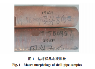 鉆桿的宏觀形貌如圖1所示,一件管體有明顯 的塑性變形,為失效鉆桿;另一件無明顯損傷,為同 批 未 失 效 鉆 桿。 鉆 桿 規(guī) 格 為 ?139.7 mm × 9.17mm,鋼級為S135,該批鉆桿的訂貨標準為API Spec5DP-2009。