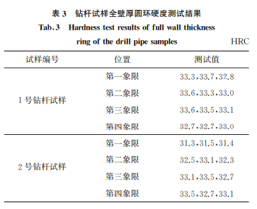 1號試樣已經(jīng)發(fā)生了嚴重的變形,所以其拉伸 和沖擊試樣無法取樣。根據(jù) APISpec5DP-2009標 準,從2號試樣上取全壁厚板條拉伸試樣、V型缺口 夏比沖擊試樣,從1號和2號試樣上取全壁厚圓環(huán) 硬度試樣。分別采用 WAW-600型電液伺服萬能試 驗機、JBN-300型擺錘沖擊試驗機和600MRD型數(shù) 顯洛氏硬度計進行拉伸、沖擊和硬度試驗,試驗結(jié)果 見表2和表3。由試驗結(jié)果可知,與擠扁鉆桿同批 次生產(chǎn)的2號鉆桿材料的拉伸性能、沖擊吸收能量 符合 APISpec5DP—2009標準要求;1號鉆桿試樣和2號鉆桿試樣在整個圓周的截面硬度相近,1號 鉆桿在擠扁變形區(qū)的硬度與其他區(qū)域的硬度沒有明 顯差異,比較均勻。