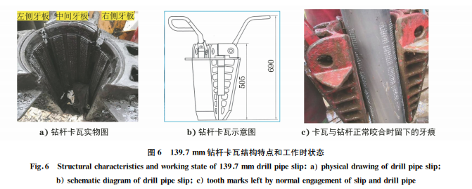 卡瓦是鉆井作業(yè)中鉆具起下鉆時常用的井口工 具,139.7mm 鉆桿使用的卡瓦實物圖見圖6a),結(jié) 構示意圖見圖6b)。由圖6可知,卡瓦由3頁卡瓦 體組成,每頁卡瓦體上分布有3列牙板,每列牙板間 的間距為10mm。中間卡瓦頁與左、右卡瓦頁間的 牙板間隙為30mm。當卡瓦坐掛鉆桿時,卡瓦上的 各牙板與管體均勻接觸,在鉆桿本體外表面留下均 勻的咬痕,即各牙板受力均勻,圖6c)所示為現(xiàn)場試 驗卡瓦與鉆桿管體正常接觸時在管體留下的咬痕 形貌。