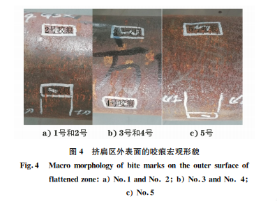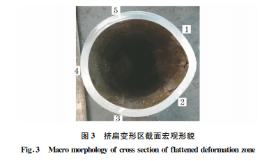 仔細觀察1號試樣擠扁變形區(qū)的整個圓周形貌, 可發(fā)現(xiàn)鉆桿管體擠扁變形不均勻,一側(cè)變形嚴重,另 一側(cè)近乎沒有變形,呈近紡錘形,如圖3所示。從圖3 還可以看出,在變形區(qū)的內(nèi)壁,涂層已損壞、破裂甚至 剝落。整個圓周外表面上的卡瓦咬痕深度并不相同, 在變形量大的兩側(cè)咬痕深,而在變形位置對應的另一 側(cè)位置則咬痕淺,如圖4所示。將外表面的卡瓦咬 痕,按順時針方向進行編號,1號咬痕和2號咬痕分 別位于最大形變區(qū)的兩側(cè),其中,1、2、3、5號咬痕所在 位置的鉆桿內(nèi)表面,涂層均有不同程度的損傷。