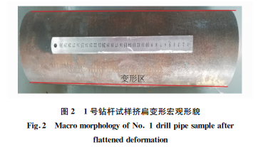 隨著高強度鉆桿的成功研發(fā)和鉆井技術的進一 步發(fā)展,鉆井的深度、水平段的長度等都有了大幅度 的提高[1]。相關數(shù)據(jù)統(tǒng)計發(fā)現(xiàn),2000年以前,我國 超過7000m以上超深井的數(shù)量僅為3口,2010年 前只有19口,到2020年,已超過600口。為了減少 起下鉆時間,提高鉆井安全和效率,現(xiàn)在大部分井區(qū) 采用“一卡一吊”的起下鉆作業(yè)方式,起下鉆時通過 給卡瓦施加一個橫向載荷使其咬入鉆桿表層,通過 摩擦力克服鉆桿的重力載荷。隨著井深越大,井下 的鉆具所受重力也會越來越大,井口卡瓦對鉆桿的 夾緊力也必然會增加,卡瓦咬入的區(qū)域通常在距離 鉆桿接頭母端600~900mm的區(qū)域內(nèi),在該區(qū)域內(nèi) 留下的卡瓦咬痕或者劃痕經(jīng)常會引發(fā)鉆桿發(fā)生刺漏 現(xiàn)象[2-4],當卡瓦對鉆桿的徑向應力超過鉆桿的擠毀 強度時,鉆桿將會發(fā)生塑性變形而失效[5-6]。某井發(fā) 生了多次鉆桿擠扁變形現(xiàn)象,筆者取回了部分失效 鉆桿并結(jié)合實際工況對其進行檢驗和分析,以期類 似事故不再發(fā)生。